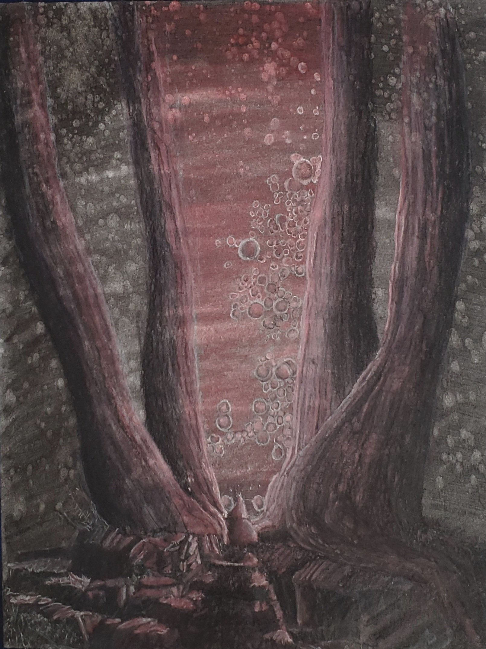 This is a idea I had where I wanted to play around with a charcoal under drawing. I applied vine charcoal in various ways and then used a water color sponge dry to smudge the charcoal. Then I sprayed it with mineral spirits and then let it dry and the added fixative. The mineral spirits add a stipled effect while blending the charcoal.